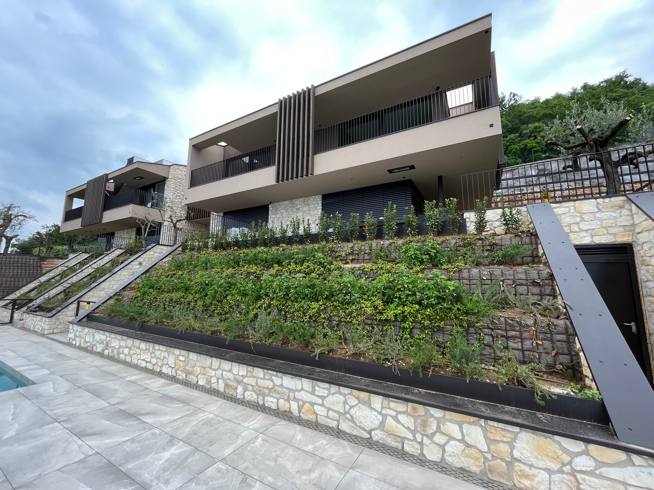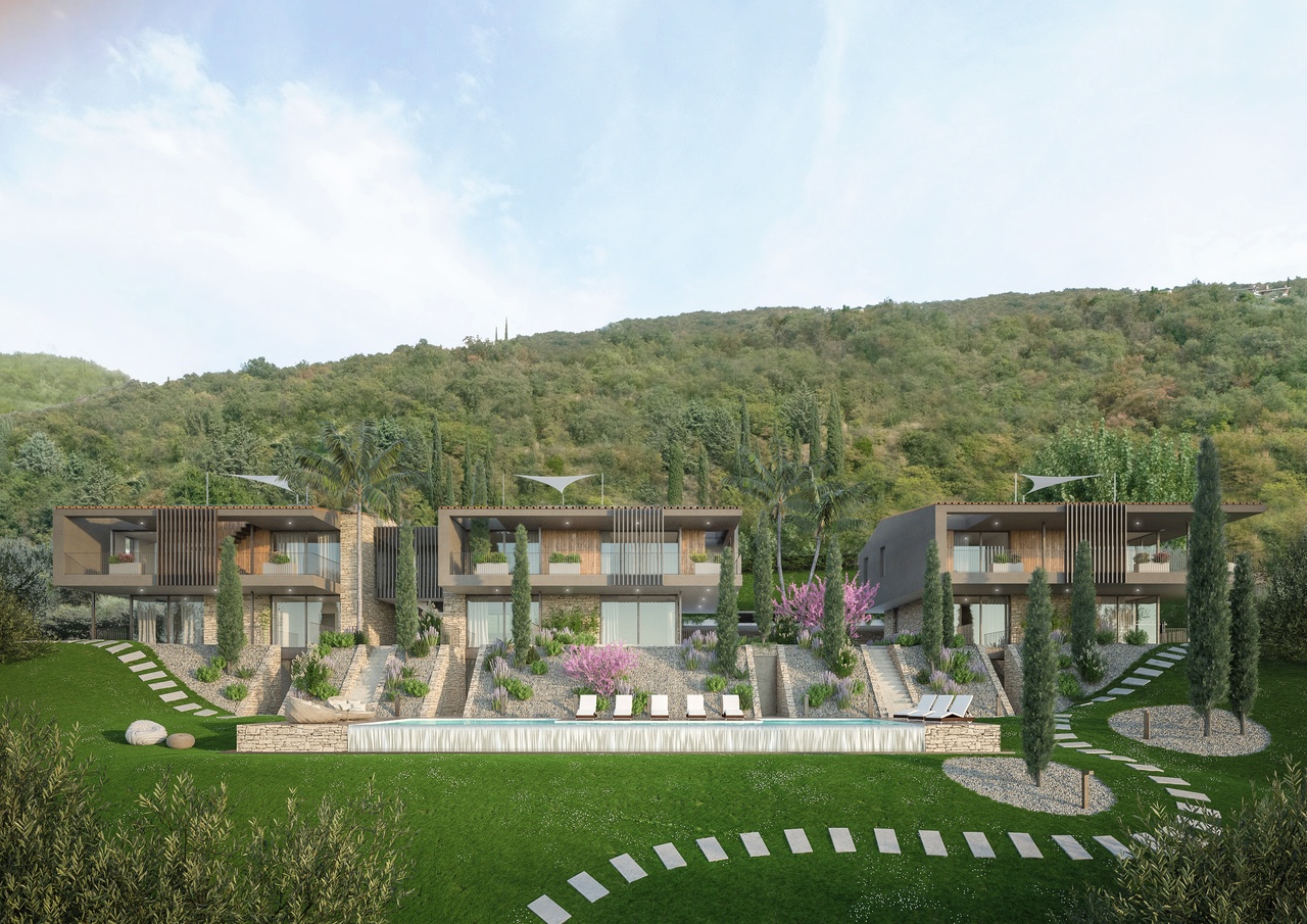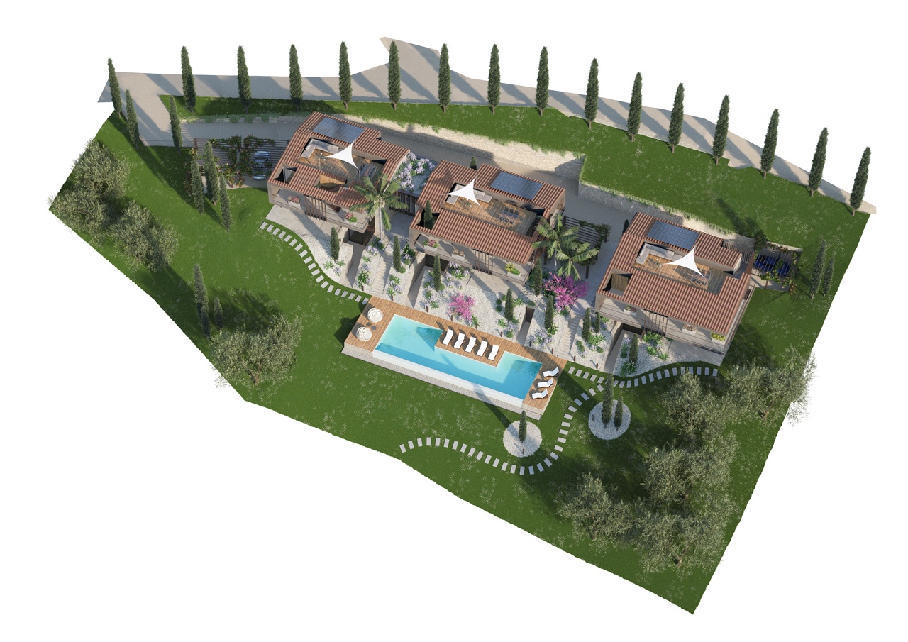 Il residence è concepito con 3 costruzioni separate, e per ogni edificio sono presenti due unità immobiliari separate in verticale. Ogni unità ha ingresso indipendente. Sono presenti posti auto coperti e scoperti, tutti riservati per ogni singola unità.